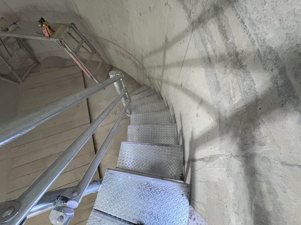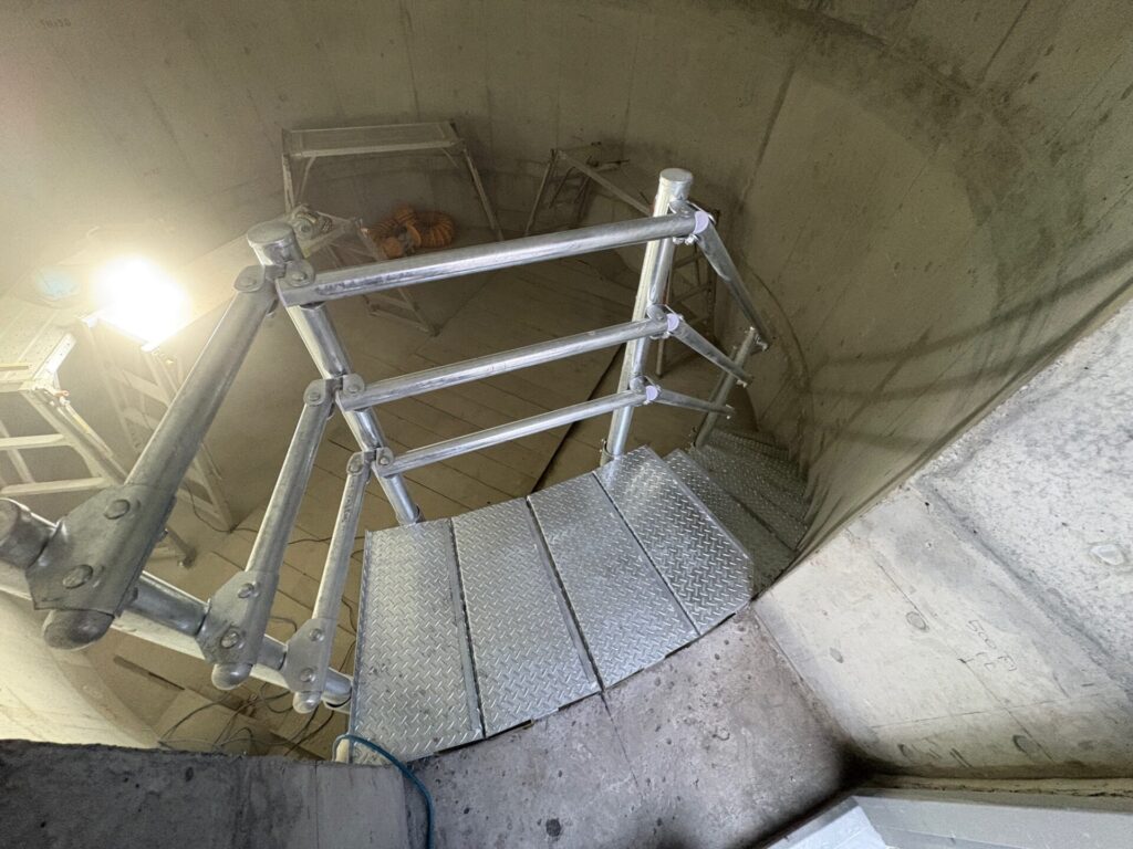 当社の人気定番商品「鋼製簡易階段」を人孔内にらせん状に設置したいとお問い合わせがあり、環境に合わせてサイズなどを調整した図面を描き、製作いたしました。